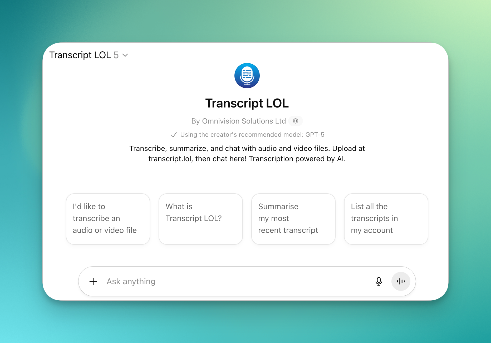 Take your transcript workflow to the next level with our Custom GPT now available on the OpenAI GPTs store. This specialized AI assistant is trained specifically for Transcript LOL, offering tailored suggestions, insights, and capabilities that understand the unique context of your transcription needs. Access it directly from the OpenAI platform and run your transcript through any OpenAI model you like.