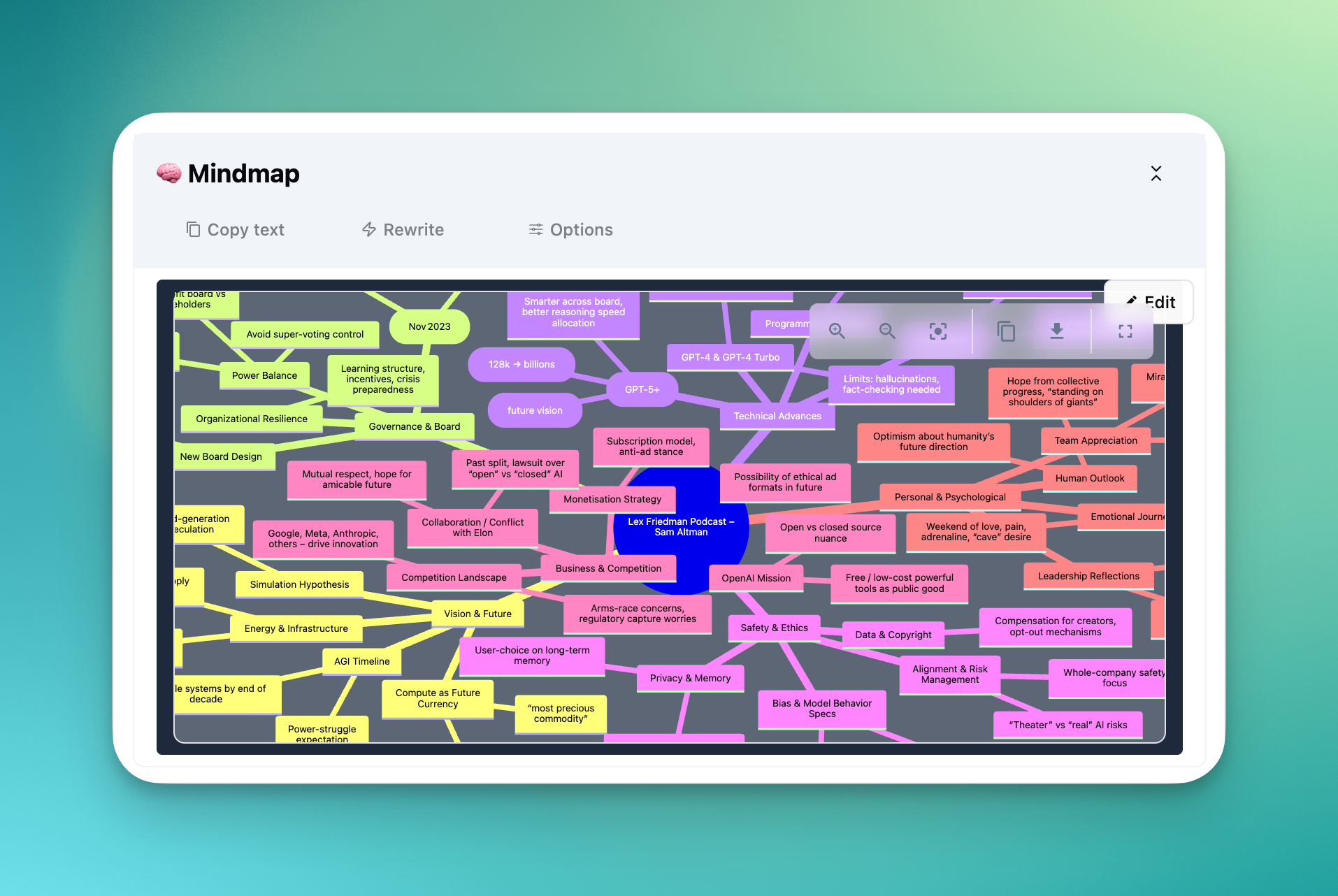 Visualize your ideas like never before with our new diagram rendering capabilities. AI outputs can now generate mindmaps, graphs, flowcharts, and other visual representations directly within your transcripts. This feature helps you organize complex information, brainstorm ideas, and create visual summaries that make your content more engaging and easier to understand at a glance.