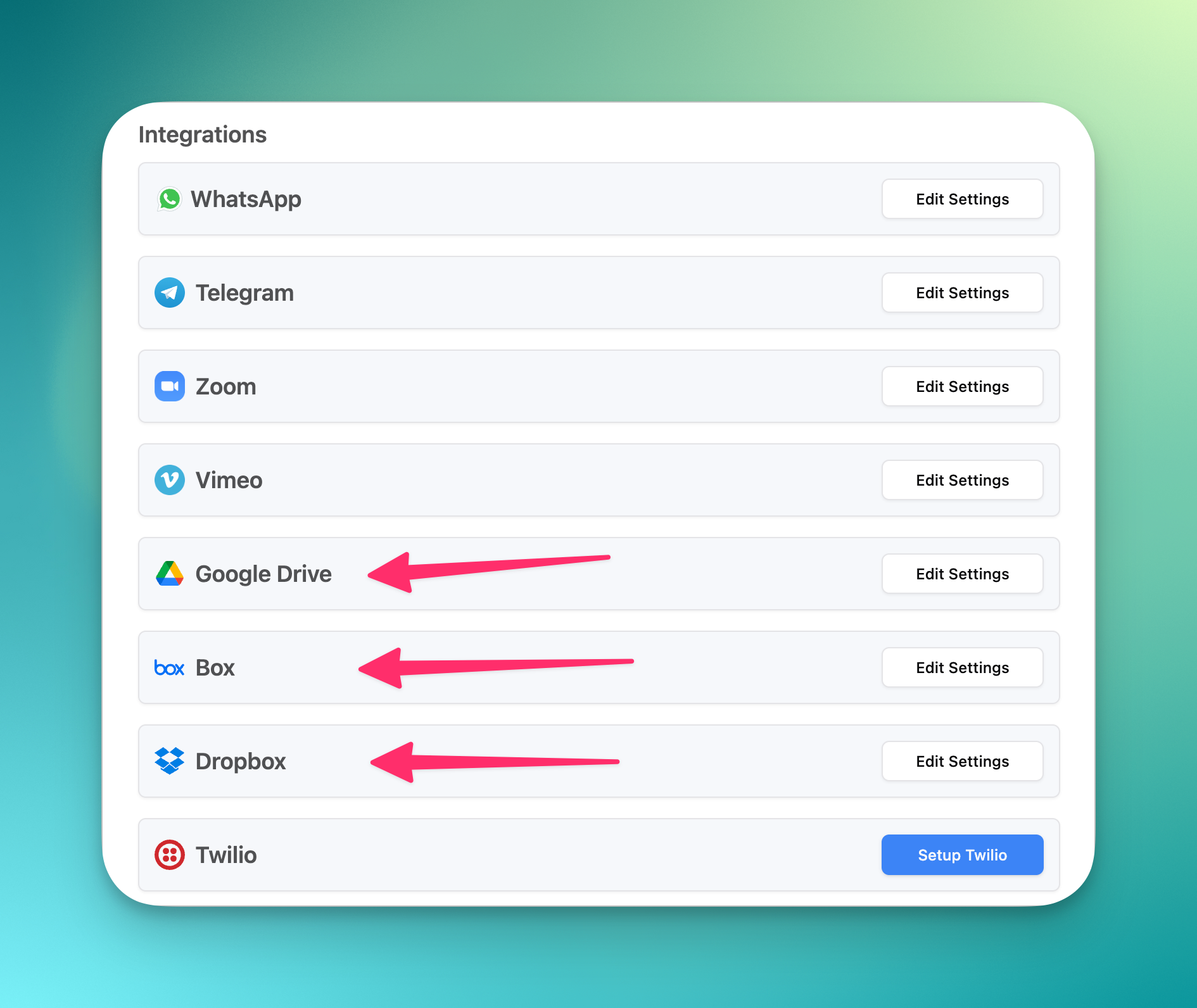 Head over to account integrations page to get started. Also checkout docs of each integration for more details.