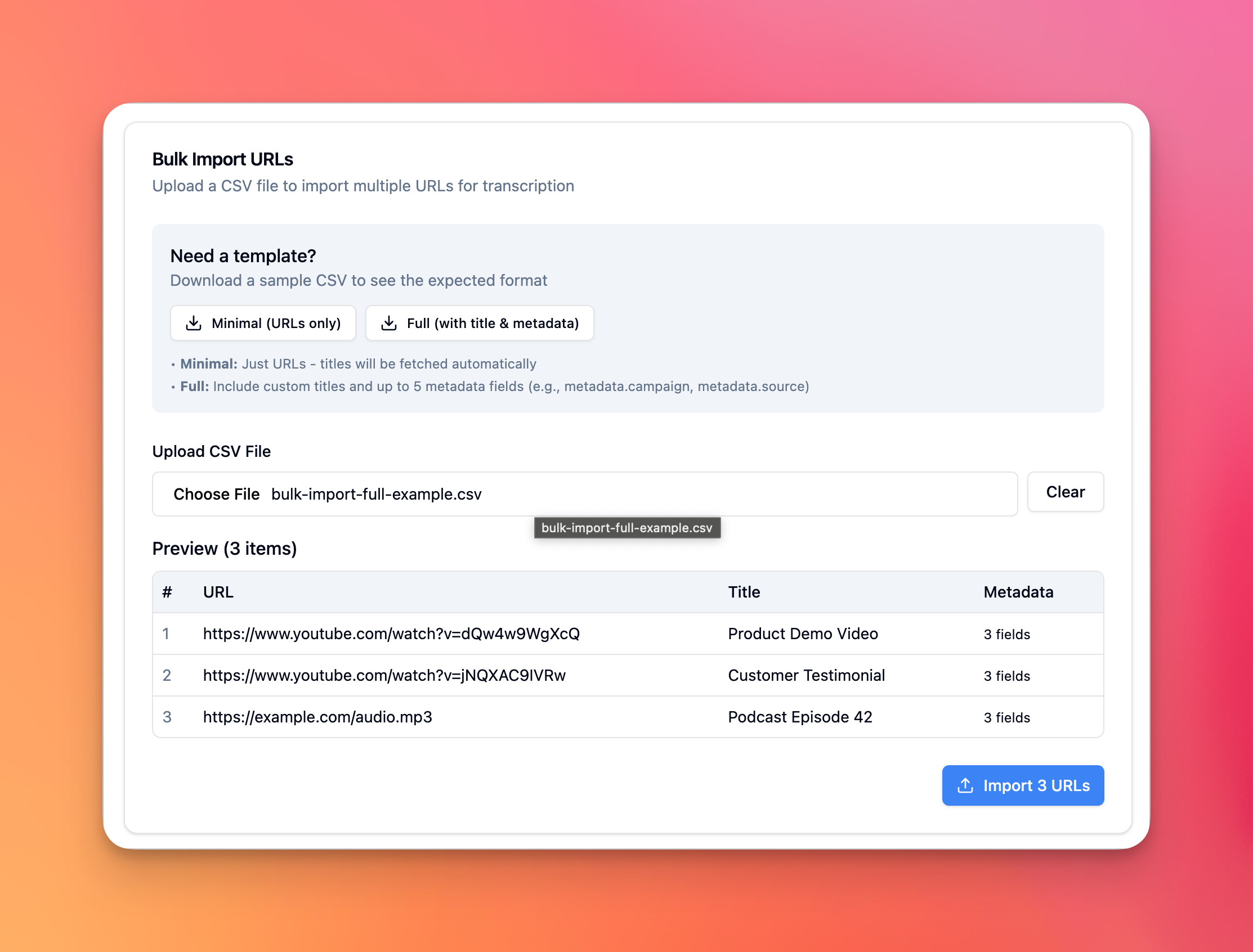 Implement bulk URL imports functionality