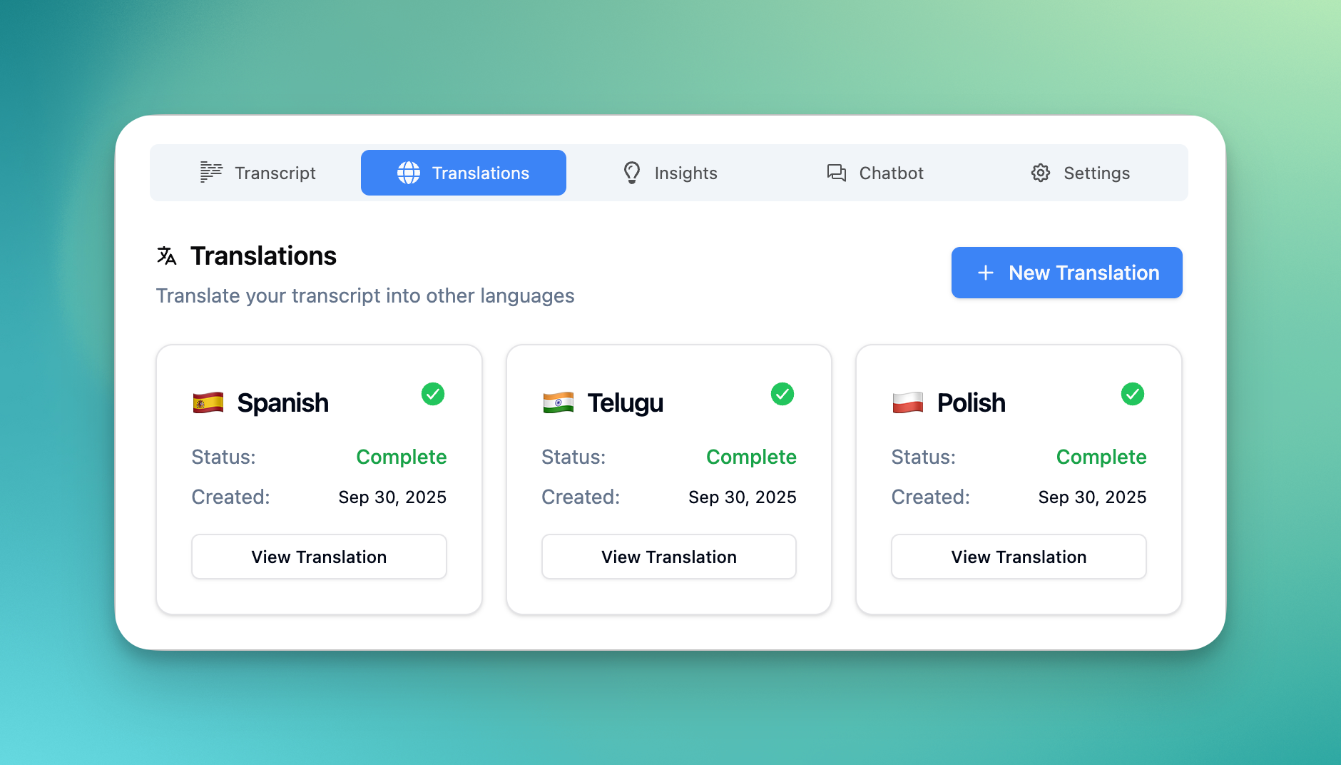 The entire dashboard is now available in Spanish, Portuguese, German, and Italian alongside English. Every button, menu, settings page, and dialog has been translated—from billing and team management to the transcript editor and keyboard shortcuts.
