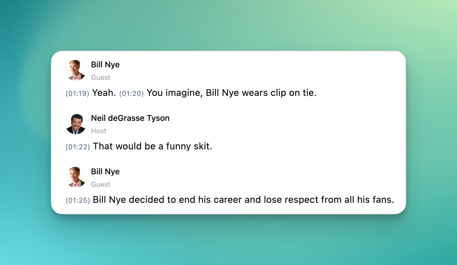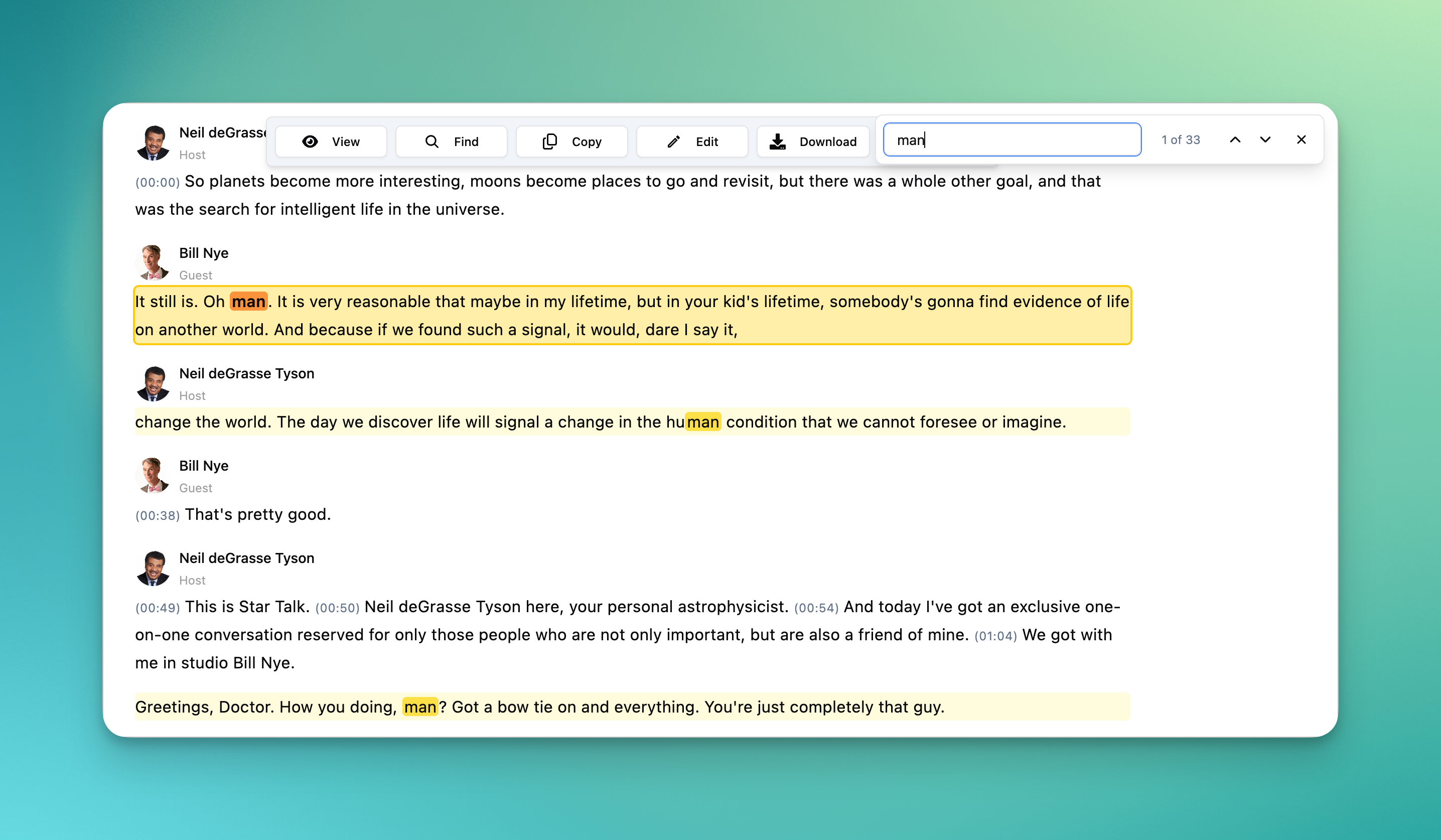 A new Find widget helps you search within transcripts faster and more intuitively than the default browser find feature. Hit CMD+F (or CTRL+F on Windows) to open it.