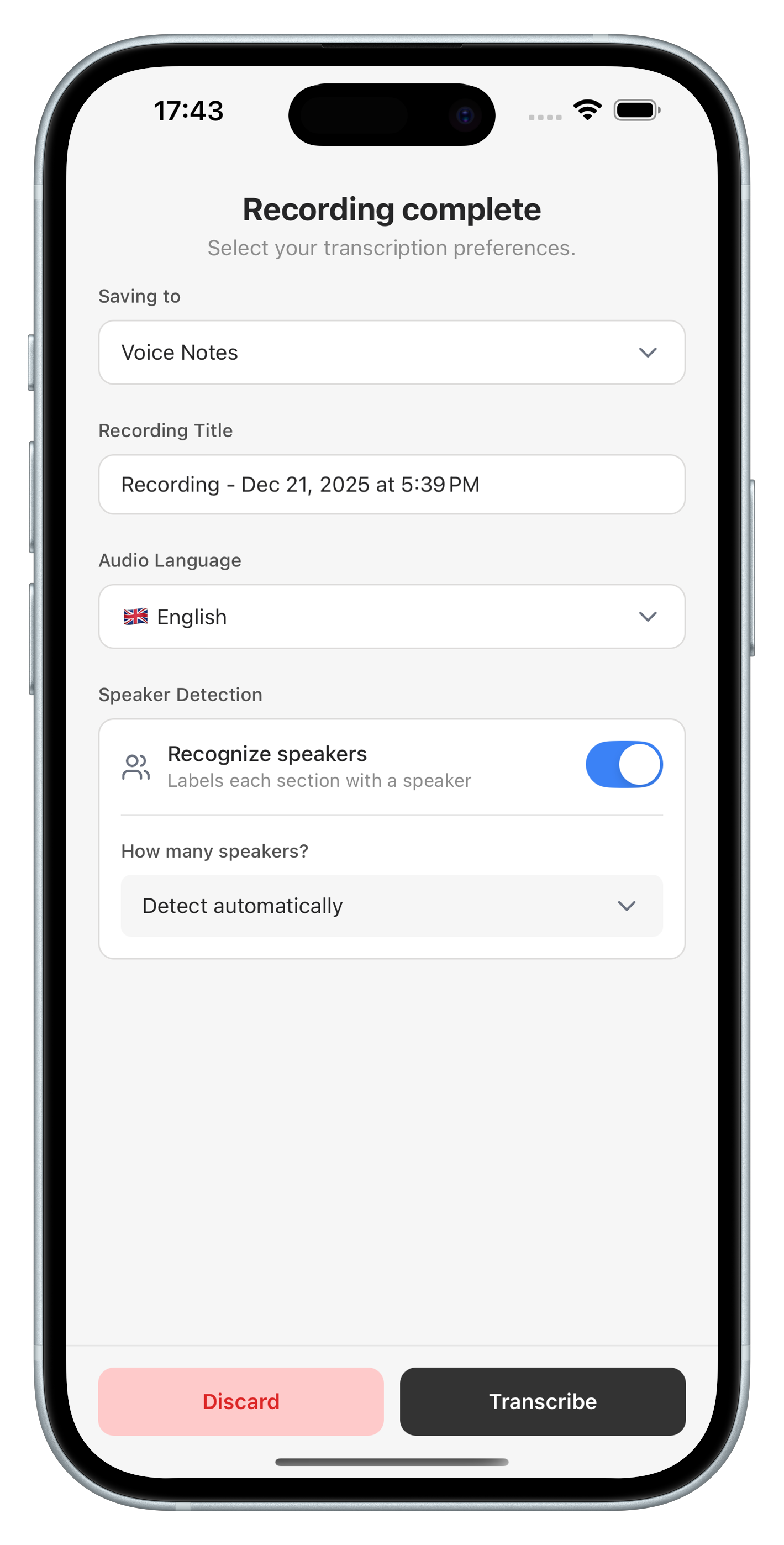 Record directly from your phone, browse your transcript library, and view recordings on the go. The apps include all 62 supported languages, dedicated recording screens with transcription options, and full speaker detection settings.