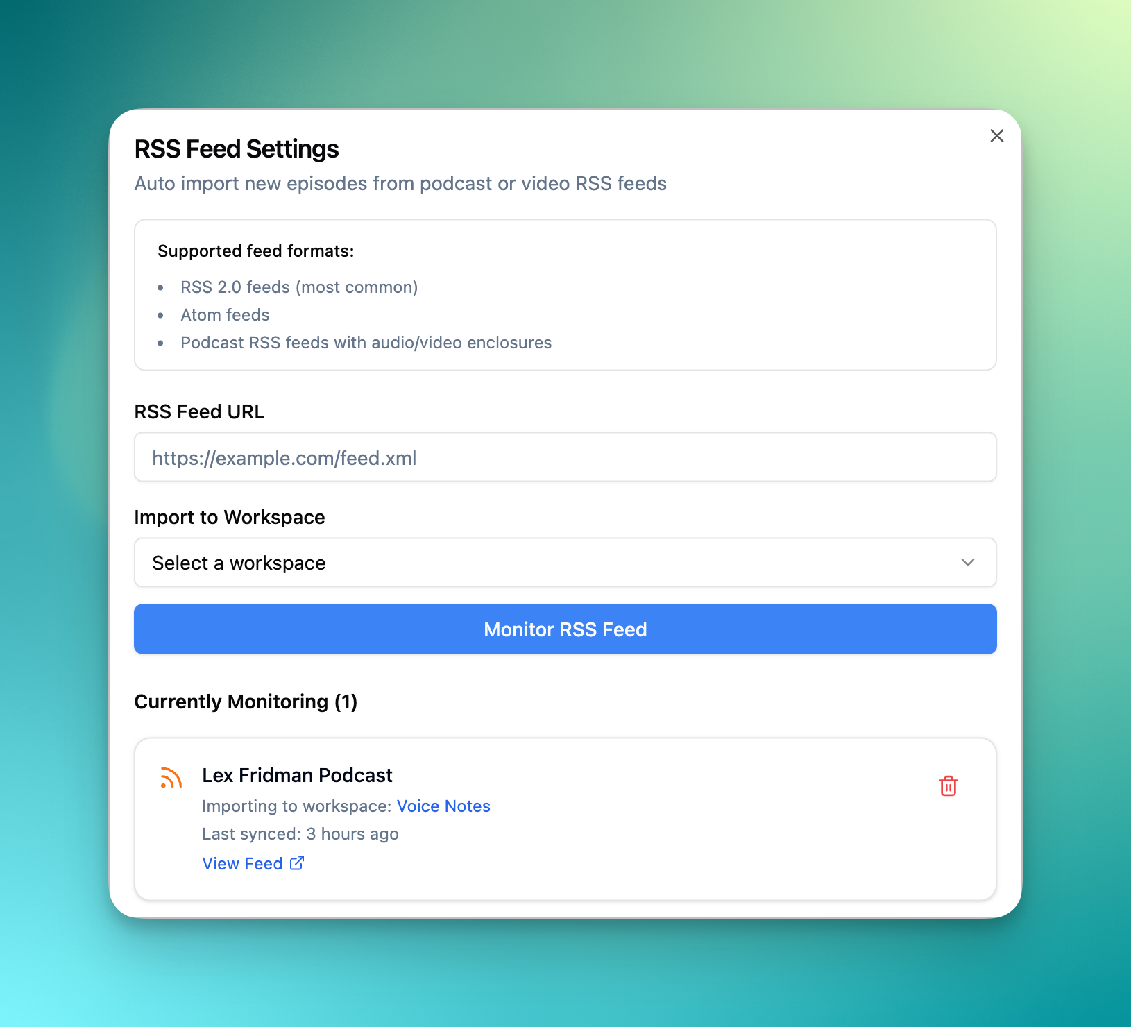 You can now add RSS feed URLs in your integrations to auto-import new podcast episodes as they're published. Perfect for podcasters who want every episode transcribed automatically, or researchers tracking specific shows.