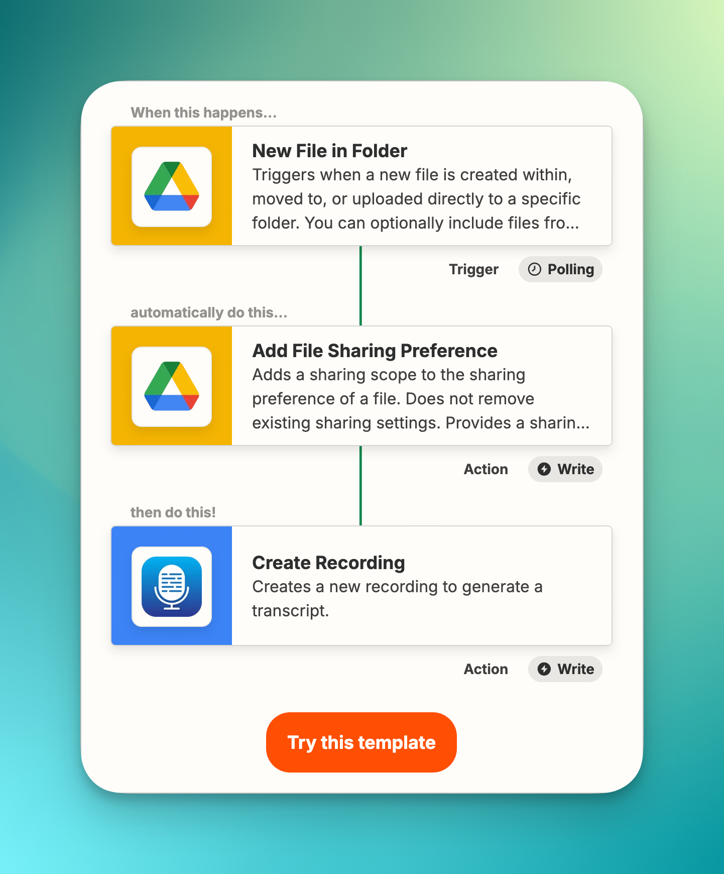 The automated import flow can be used to create a set and forget workflow automation between Google Drive and Transcript LOL.